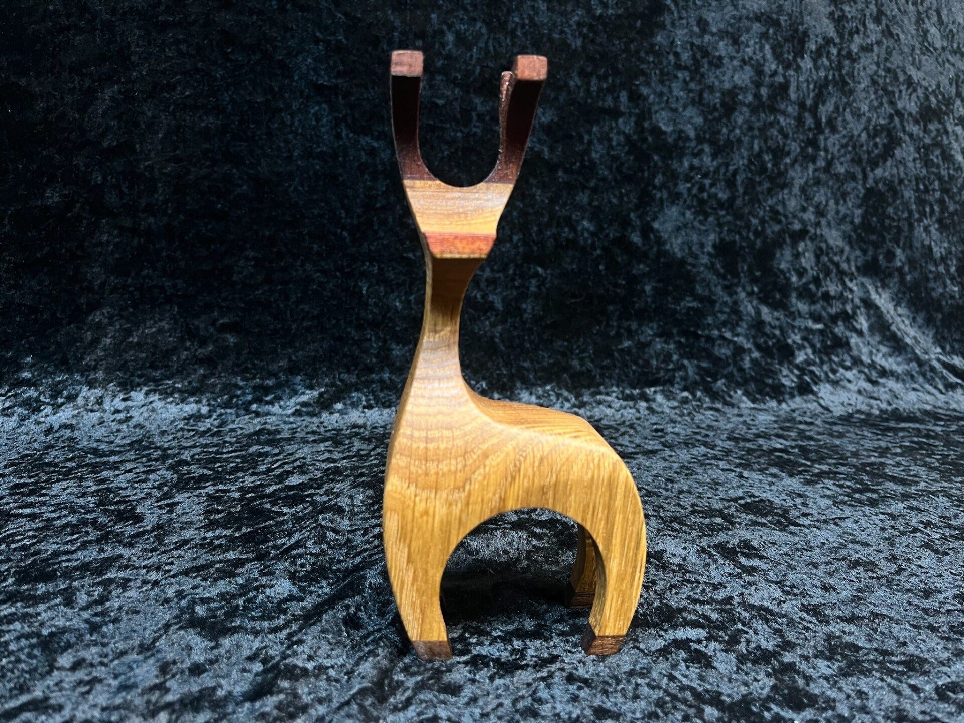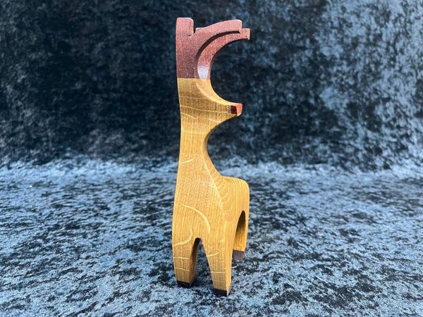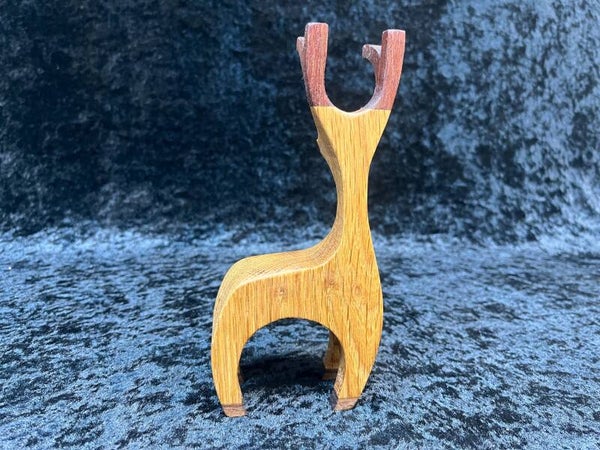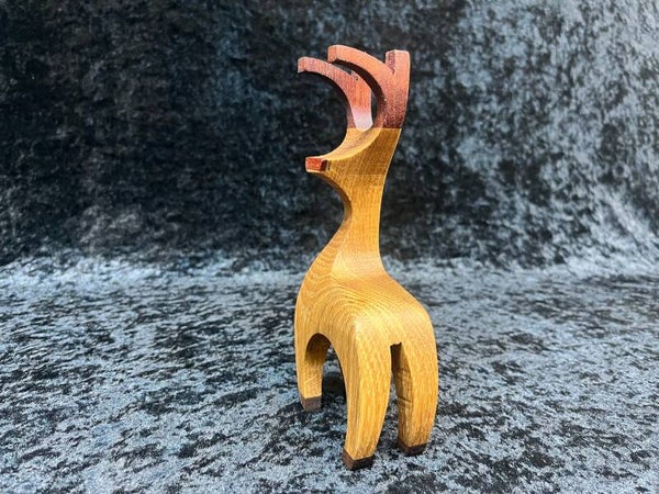 Ons hertje is gemaakt van eiken(lijfje) mahonie (gewij) en amerikaans noten hout (voetjes).